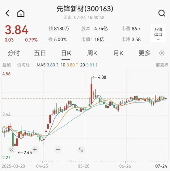 截至7月24日收盘,先锋新材股价报3.84元/股,总市值为18亿元。