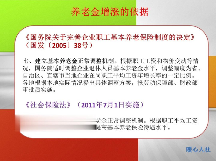 企业退休人员的养老金增长依据,主要是2005年《国务院关于完善企业职工基本养老保险制度的决定》确定的,明确了要根据社会平均工资和物价变动情况调整养老金。不过,只有2005至2007年是由各省份结合当地的社会平均工资增长的60%、100%和70%确定调整比例。从2008年开始,由人社部、财政部统一确定养老金调整水平。