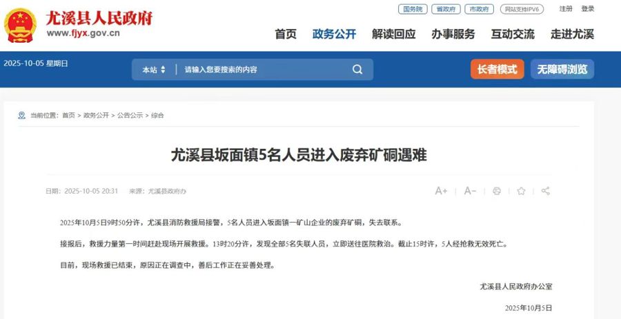 2025年10月5日9时50分许,尤溪县消防救援局接警,5名人员进入坂面镇一矿山企业的废弃矿硐,失去联系。